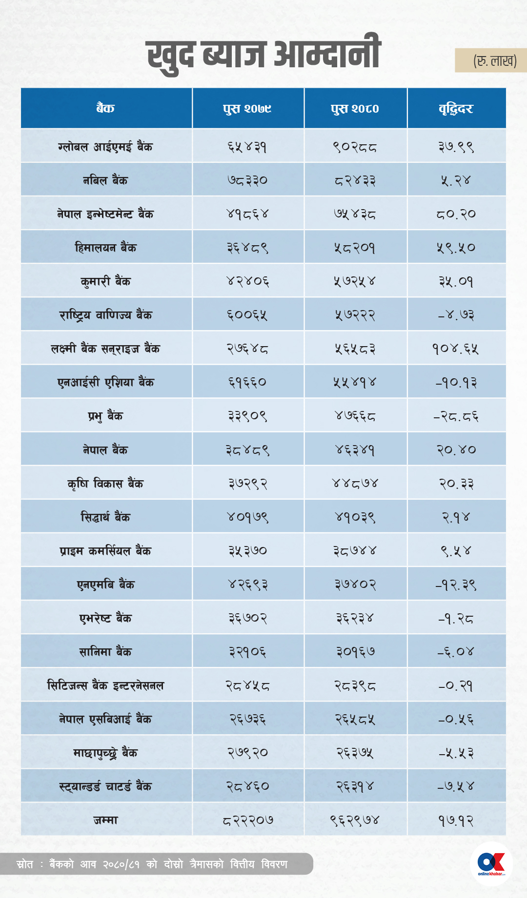 यस्तै ग्लोबल आईएमईको करिब ३८ प्रतिशत बढेर सबैभन्दा धेरै ९ अर्ब २ करोड पुगेको छ । हिमालयन ५९ प्रतिशत बढेर ५ अर्ब ८२ करोड, कुमारी ३५ प्रतिशत बढेर ५ अर्ब ७२ करोड, लक्ष्मी सनराइज १ सय ४ प्रतिशत बढेर ५ अर्ब ६६ करोड र प्रभुको खुद ब्याज आम्दानी ४०.५८ प्रतिशतले बढेर ४ अर्ब ७७ करोड पुगेको छ ।